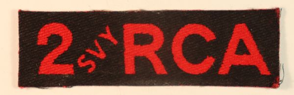 2 SVY RCA – 2nd Survey Regiment Royal Canadian Artillery WW2 British Made Printed Shoulder Title Badge – CALICO PRINTERS — Lot No. 6668A