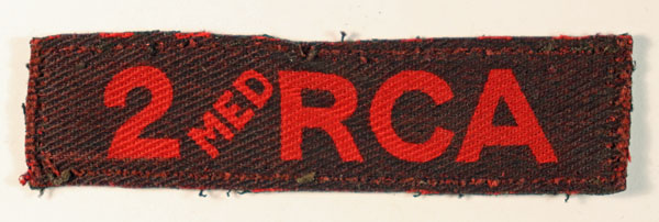 This is a British made WW2 printed cloth shoulder title badge to the 2nd MEDIUM REGIMENT R.C.A. who took part in the Italian Campaign (Jon Mills BoBD 3248) in excellent worn condition. The badge was made by “Calico Printers”.