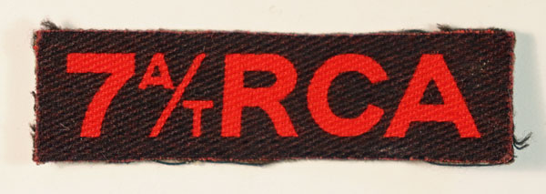 This is a British made WW2 printed cloth shoulder title badge to the 7 A/T RCA – 7th ANTI-TANK REGIMENT R.C.A. – 1st Canadian Corps in excellent unworn condition. The badge was made by “Calico Printers”.