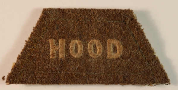 This is a rare WW1 embroidered cloth slip-on shoulder title badge to the HOOD Battalion, ROYAL NAVAL DIVISION in excellent worn condition.