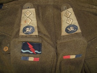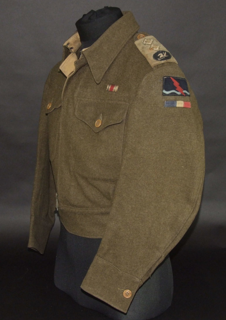 On page 543 (with credit to Jon Mills) he says of the Raiding Forces Middle East “By the time the Germans surrendered in North Africa on the 12thMay 1943, the desert Special Forces which had contributed to the victory had been reorganised as Raiding Forces Middle East, their future role uncertain. Formed at the beginning of April Raiding Forces included the Long Range Desert Group, the Greek Sacred Squadron, and 1st SAS – no longer commanded by Major David Stirling who had been captured in January – and shortly to be divided to form the Special Raiding Squadron and the Special Boat Section. Serving alongside these Special Services on subsequent operations in Italy and the Adriatic were the Royal Signals Personnel of Raiding Force Signals who wore their own Arm badge and provided rear link detachments for the unit” This is the Formation Badge shown on page 544 of his book and the very one sewn to this Battledress.