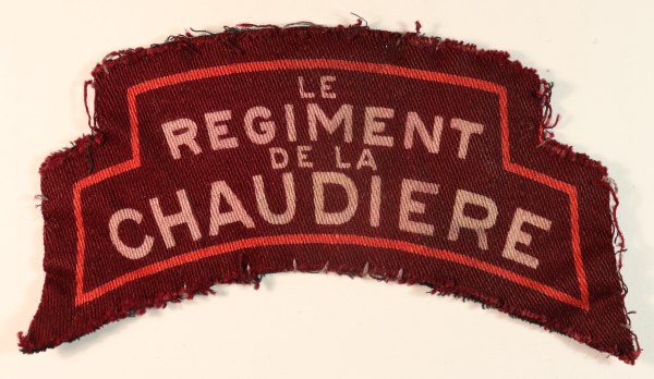This is a British made WW2 Canadian printed cloth shoulder title badge to LE/REGIMENT/DE LA/CHAUDIERE (Jon Mills BoBD 3315) – 3rd Canadian Infantry Division in excellent worn condition. The badge was made by “Calico Printers”.