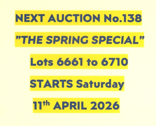 The next auction – No.138 “THE SPRING SPECIAL” – Lots 6661 to 6710 – will be available to view online from 1700 on FRIDAY 10th APRIL 2026 (UK TIME) and will start going live for bidding at 2130 on SATURDAY 11th APRIL 2026 (UK TIME) and will run until SATURDAY 25th APRIL 2026 then it will start to close the bidding at 2130 (UK TIME).