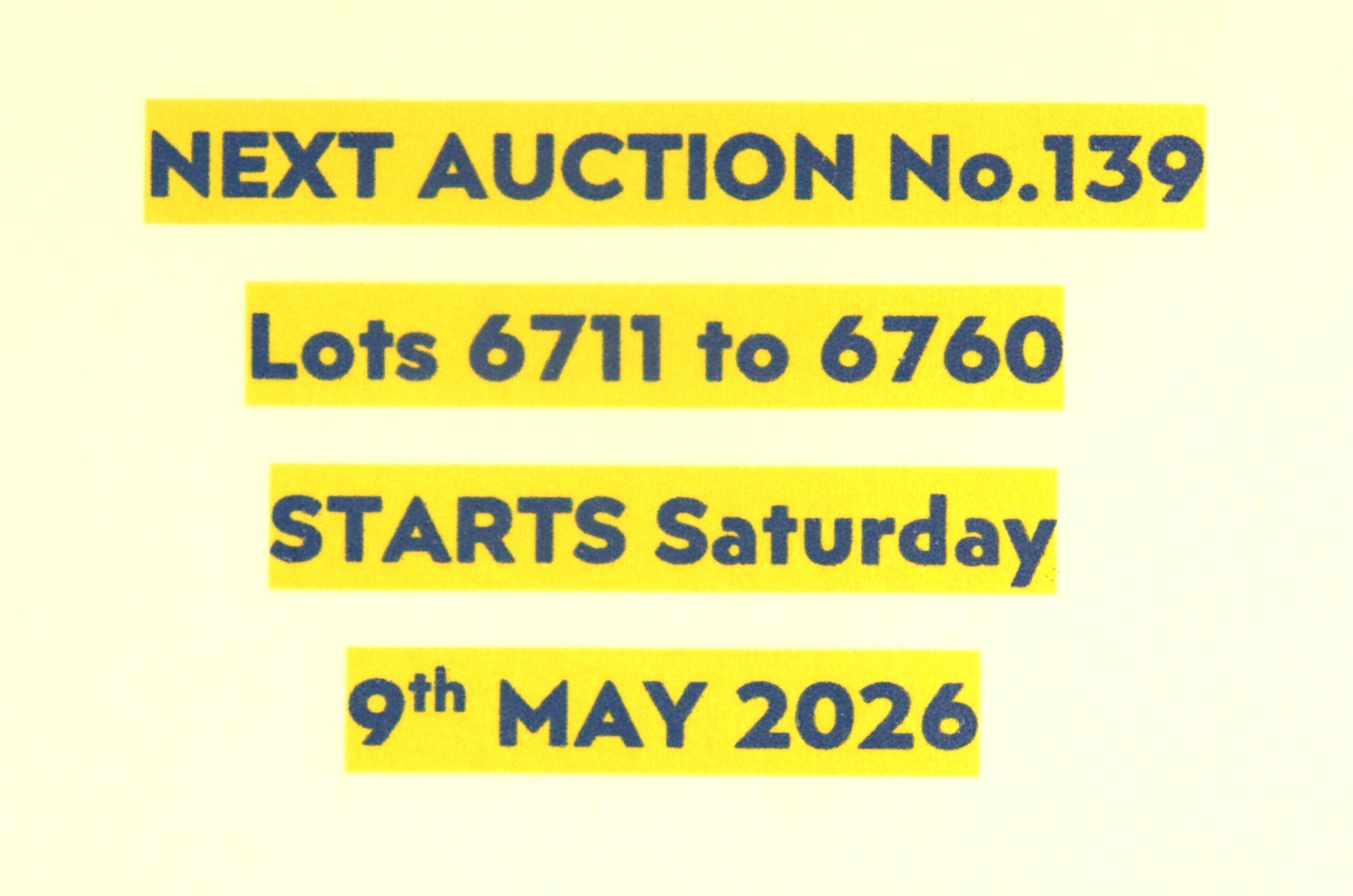 The next auction – No.139 – Lots 6711 to 6760 – will be available to view online from 1700 on FRIDAY 8th MAY 2026 (UK TIME) and will start going live for bidding at 2200 on SATURDAY 9th MAY 2026 (UK TIME) and will run until SATURDAY 23rd MAY 2026 then it will start to close the bidding at 2200 (UK TIME).