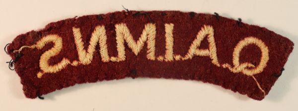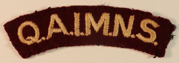 This is a scarce WW2 embroidered felt Shoulder Title Badge to the Q.A.I.M.N.S. – Queen Alexandra’s Imperial Military Nursing Service (Jon Mills BoBD 1765) in excellent worn condition.