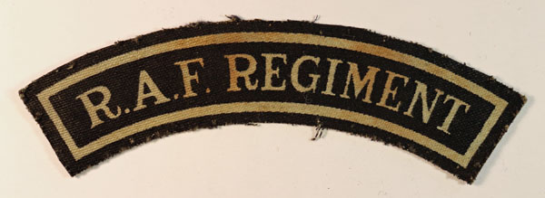 This is a WW2 printed cloth shoulder title badge to the R.A.F. REGIMENT – Serifs (Jon Mills BoBD 2367). The badge which is in excellent worn condition was made by “Calico Printers”.