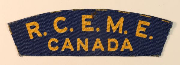 This is a British made WW2 printed cloth shoulder title badge to the R.C.E.M.E. / CANADA – Royal Canadian Electrical Engineers (Jon Mills BoBD 3345) in excellent unworn condition. The badge was made by “Calico Printers”.