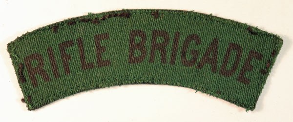 This is a WW2 printed cloth shoulder title badge to the RIFLE BRIGADE (Jon Mills BoBD 2936). The badge is in excellent worn condition and was made by “Calico Printers”
