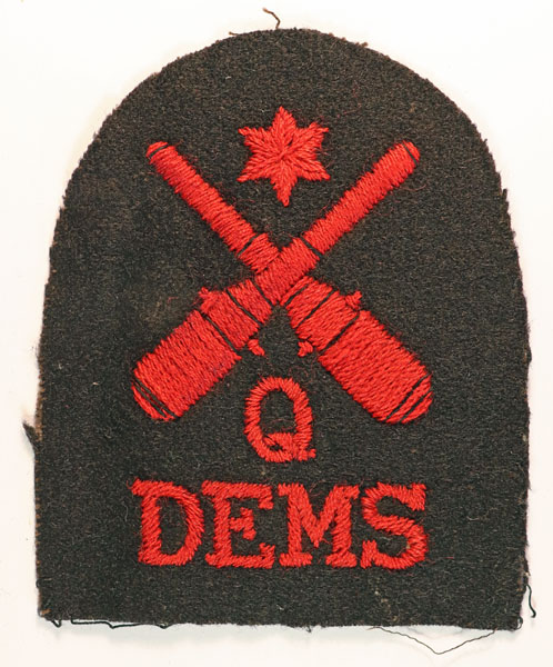 This is a WW2 embroidered felt arm badge to a ROYAL NAVY – GUNLAYER D.E.M.S. – Defensively Equiped Marchant Ships (Jon Mills BoBD 1275). The badge, which measures 107mm by 90mm is in excellent worn condition.