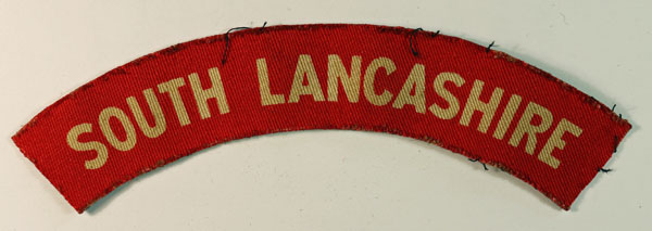 This is a WW2 printed cloth shoulder title badge to the SOUTH LANCASHIRE Regiment (Jon Mills BoBD 2962). The badge is in excellent worn condition and was made by “Calico Printers”