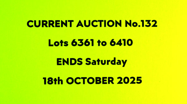 The current auction – No.133 – Lots 6361 to 6410 will run until SATURDAY 18th OCTOBER 2025 then the bidding on each lot will start to close at 2200 (UK TIME) there is a 2 minute gap between the end of each lot and the final lot No. 6410 will close at 2338 (UK TIME).